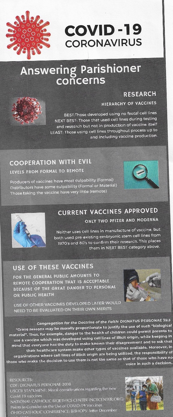 This submission is from a US Catholic Parish Bulletin from JAN 2021 that helps explain moral guidance on the vaccines for COVID. It speaks to the three major vaccines as of this timeframe. It cites references. It is below as a imagine capture of the original is below. Apologies if the image does not appear.